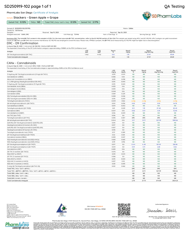 Stackers by Cali - D9+THCP+THCB - 3ct Pouch - 20 Pack Display - Green Apple Grape
