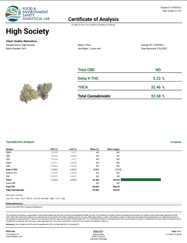 DS - Bulk Thca Indoor Exotic Flower - High Society - 32.68% - Hybrid