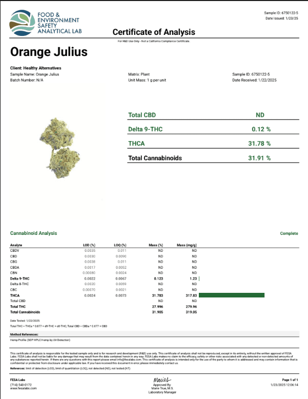 DS - Bulk Thca Indoor Exotic Flower - Orange Julius - 31.91% - Sativa